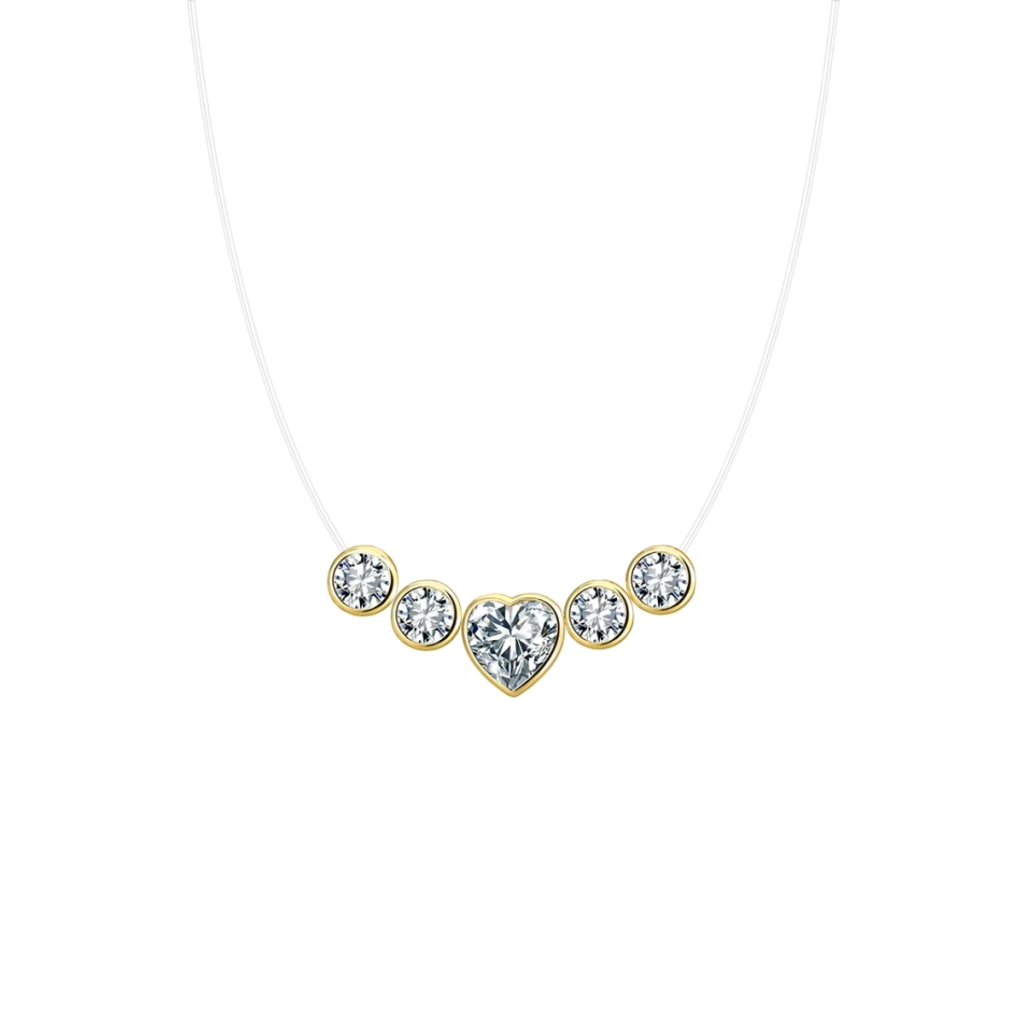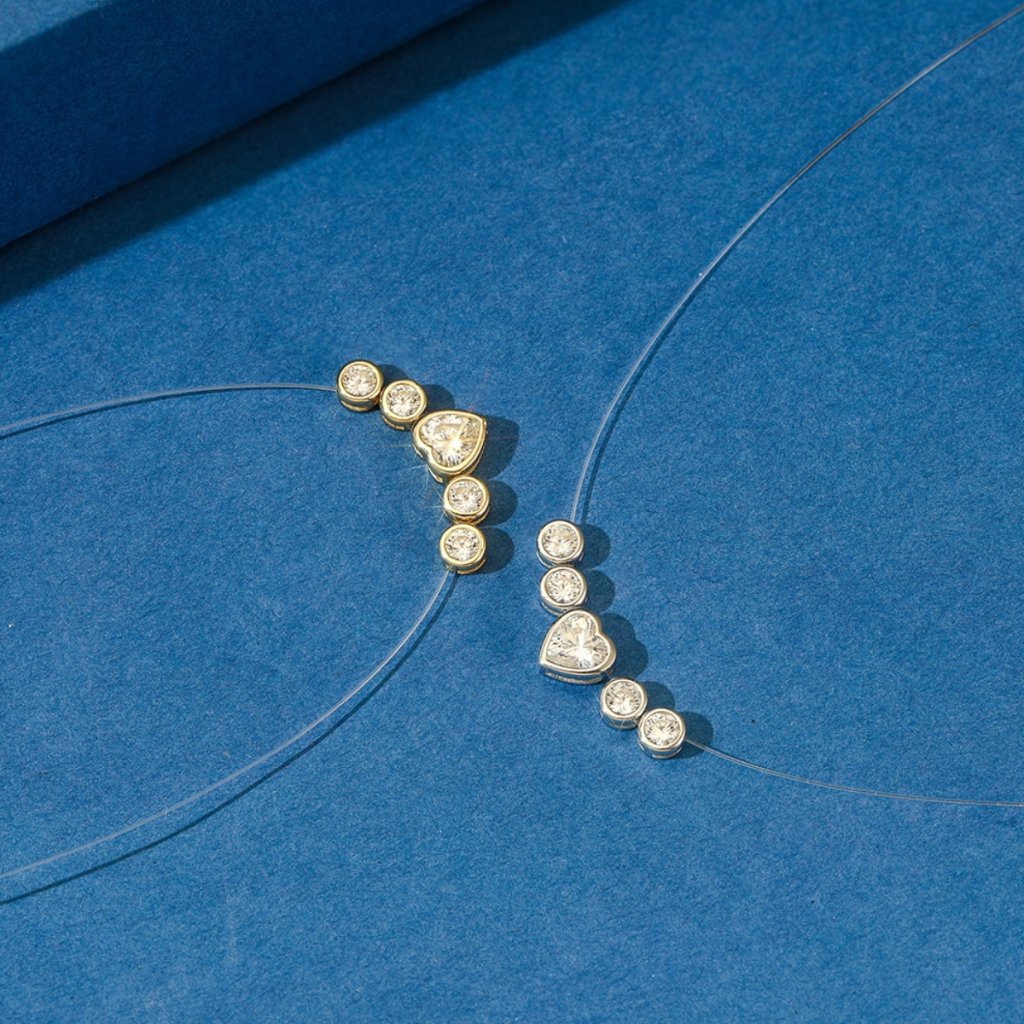 Dominantą biżuterii są eleganckie zawieszki – okrągłe, przezroczyste cyrkonie (średnica 3 mm) osadzone w pozłacanych kółkach, które doskonale odbijają światło. Przez środek kompozycji przebiega romantyczny motyw serca z przezroczystej cyrkonii (średnica 5 mm), symbol miłości i czułości.