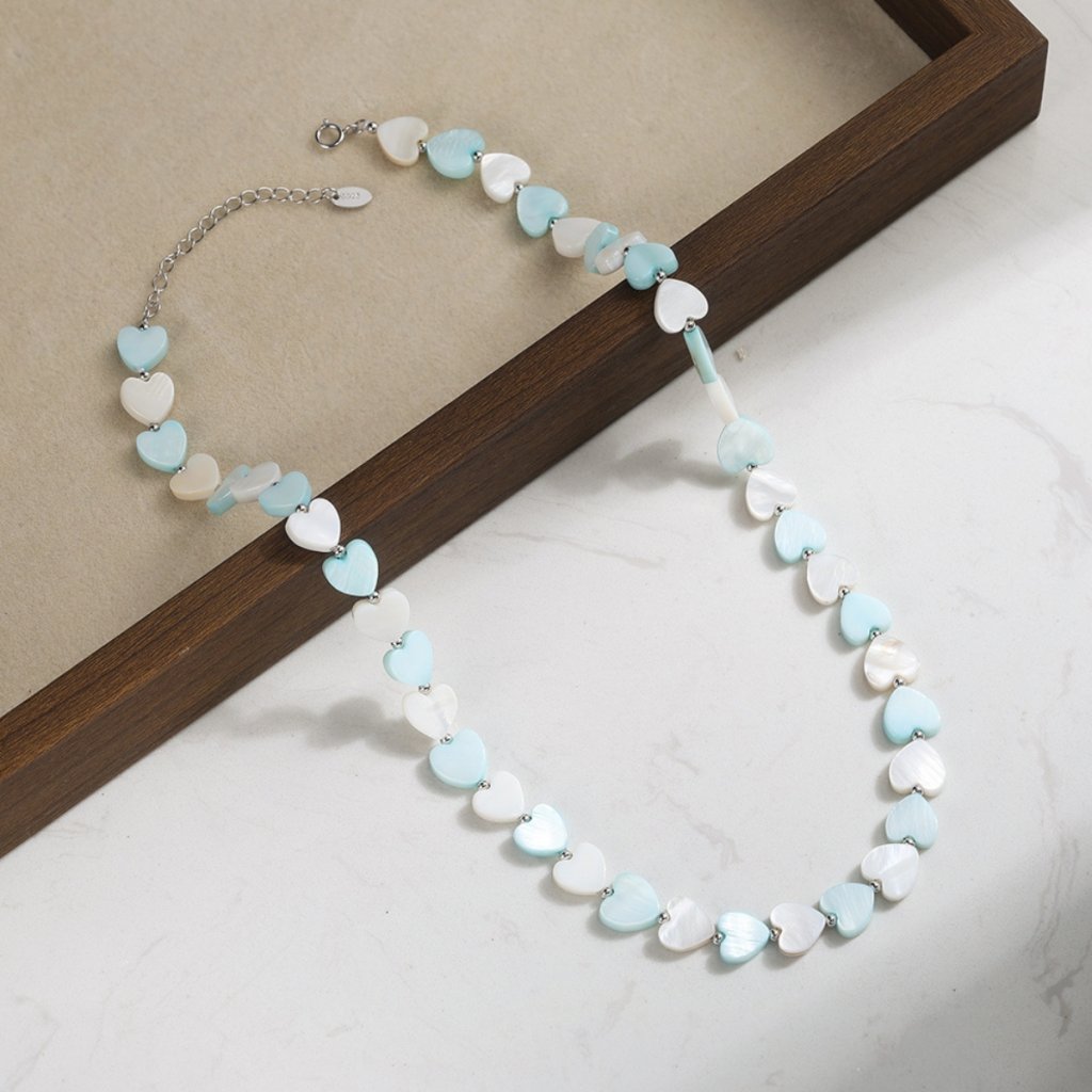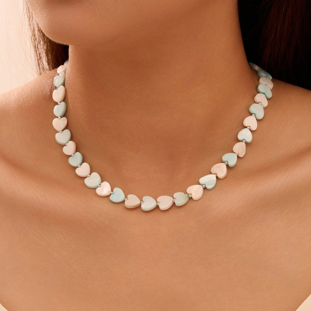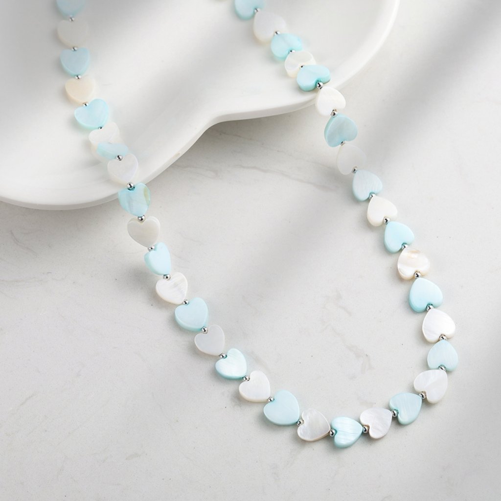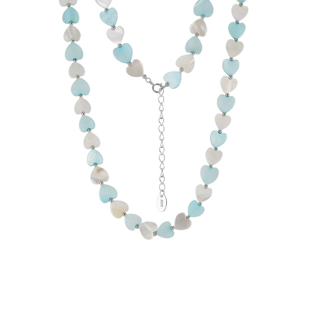 Dominantą naszyjnika są drobne serduszka uzupełnione syntetycznymi perłami w delikatnych perłowych, białych, turkusowych i niebieskich odcieniach, które wyglądają świeżo i subtelnie. Dzięki regulowanej długości 40 + 5 cm, naszyjnik wygodnie dopasowuje się do dekoltu. Wymiary elementu w kształcie serca to 8 × 8 mm, szerokość delikatnego łańcuszka wynosi 2 mm, co gwarantuje subtelny i lekki wygląd.