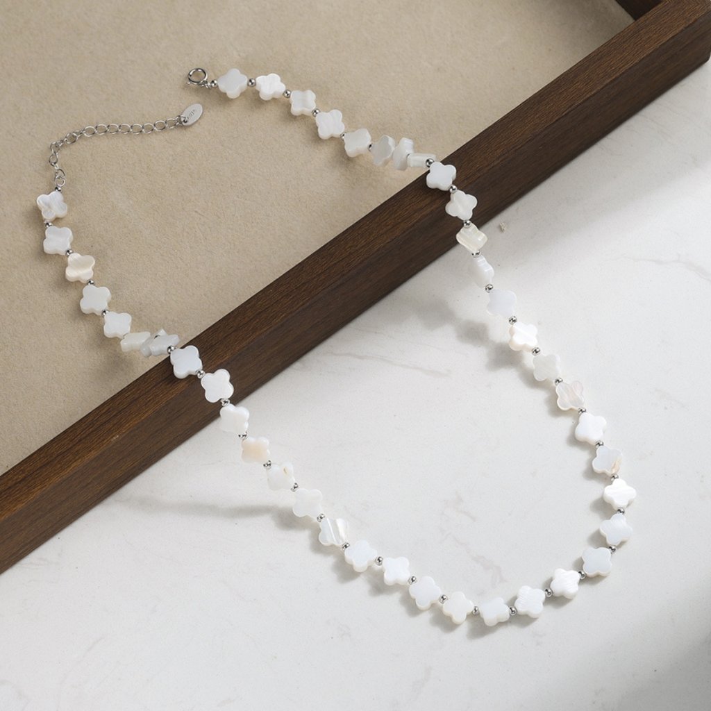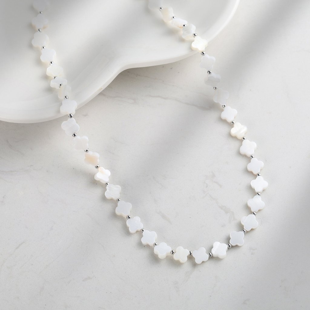 Dominującym motywem jest czterolistna koniczyna jako symbol szczęścia, uzupełniona syntetycznymi perłami w kolorze białym i perłowym, które nadają biżuterii delikatny i romantyczny charakter. Naszyjnik ma regulowaną długość 40 + 5 cm, dzięki czemu łatwo dopasowuje się do różnych typów dekoltów. Wymiary zawieszki to 8 × 8 mm, a szerokość delikatnego łańcuszka wynosi 2 mm.