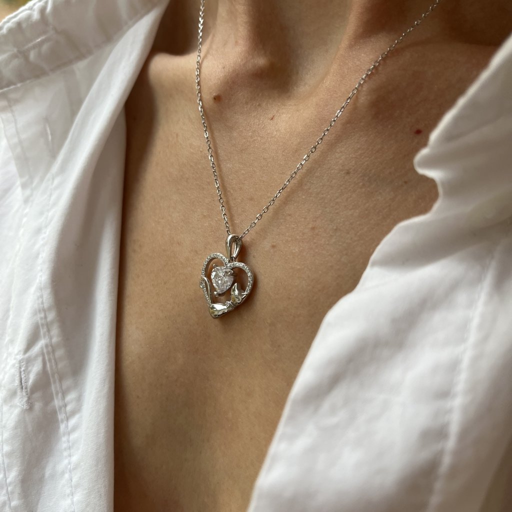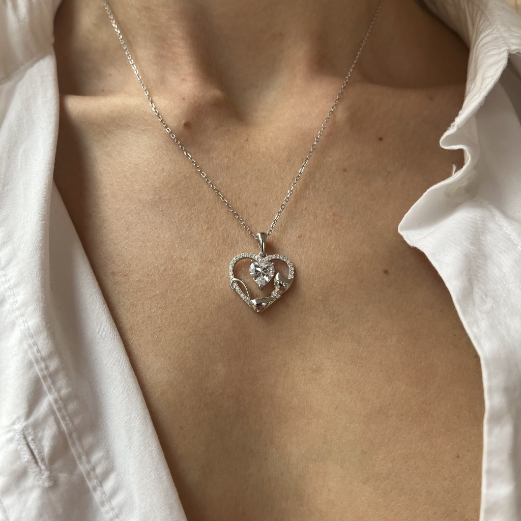 Ta misternie wykonana biżuteria wykonana jest ze srebra najwyższej próby Ag925/1000, co nadaje jej delikatny i elegancki wygląd. Wisiorek składa się z serca, które jest magicznie wysadzane błyszczącymi cyrkoniami. W dolnej części serca znajduje się szczegółowy kot, który dopełnia ogólny wygląd tego nieodpartego elementu.