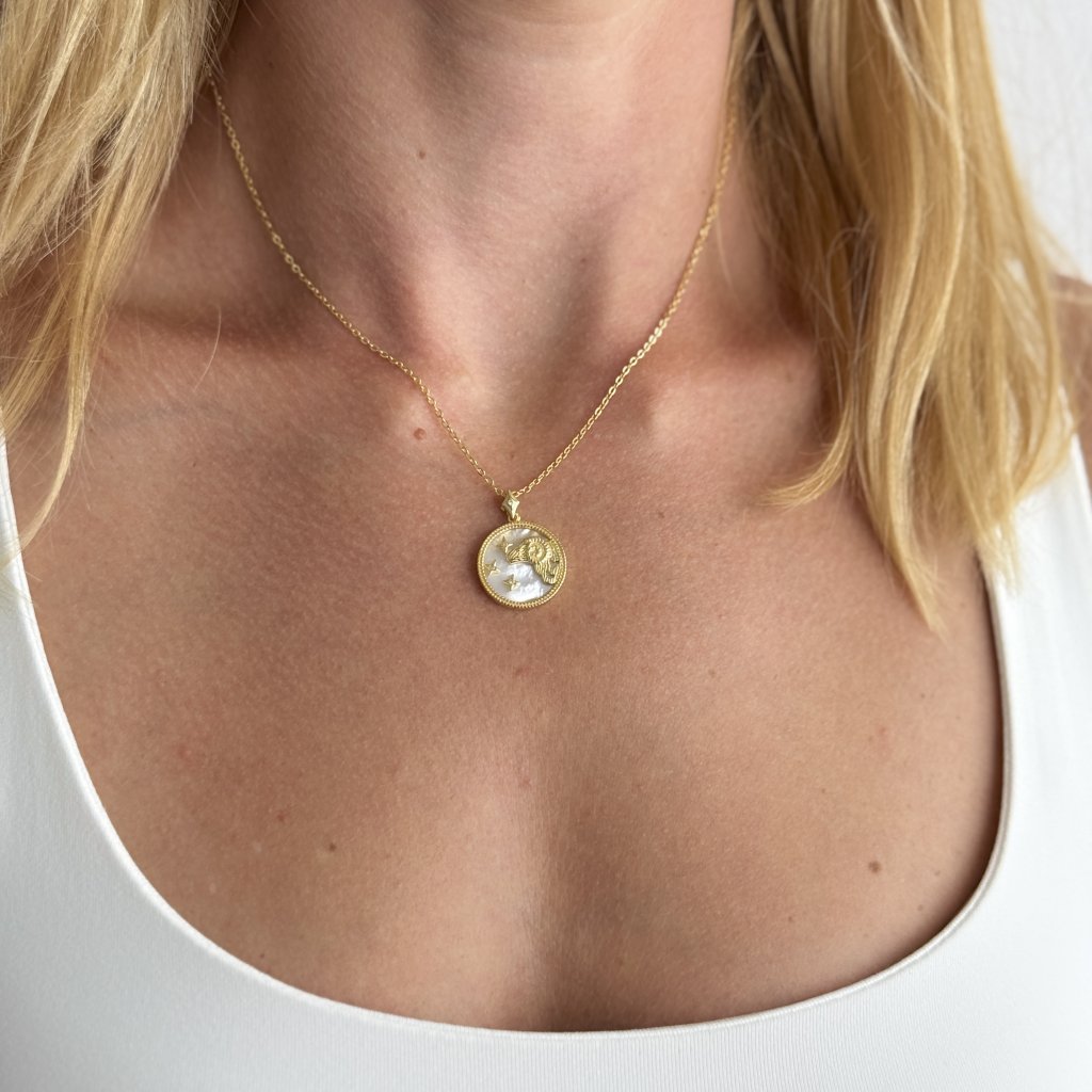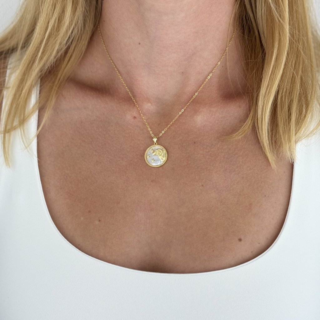 Srebrny łańcuszek wisiorek with MOONLIGHT ARIES to idealny prezent dla każdego, kto urodził się pod znakiem Barana. Ten klejnot łączy w sobie moc i piękno tego znaku ognia. Pozłacany okrągły wisiorek o średnicy 18 mm jest ozdobiony wizerunkiem Barana na białym tle, które przywołuje blask księżycowego nieba.