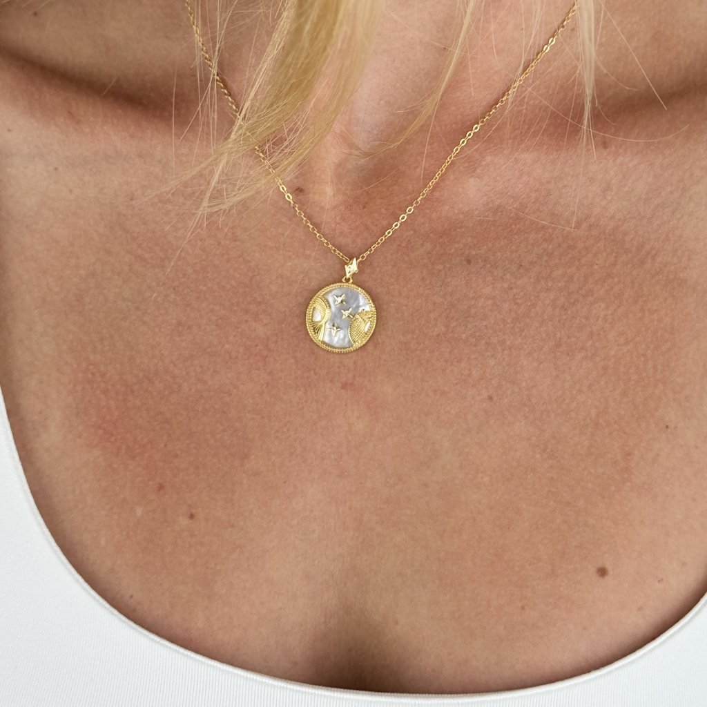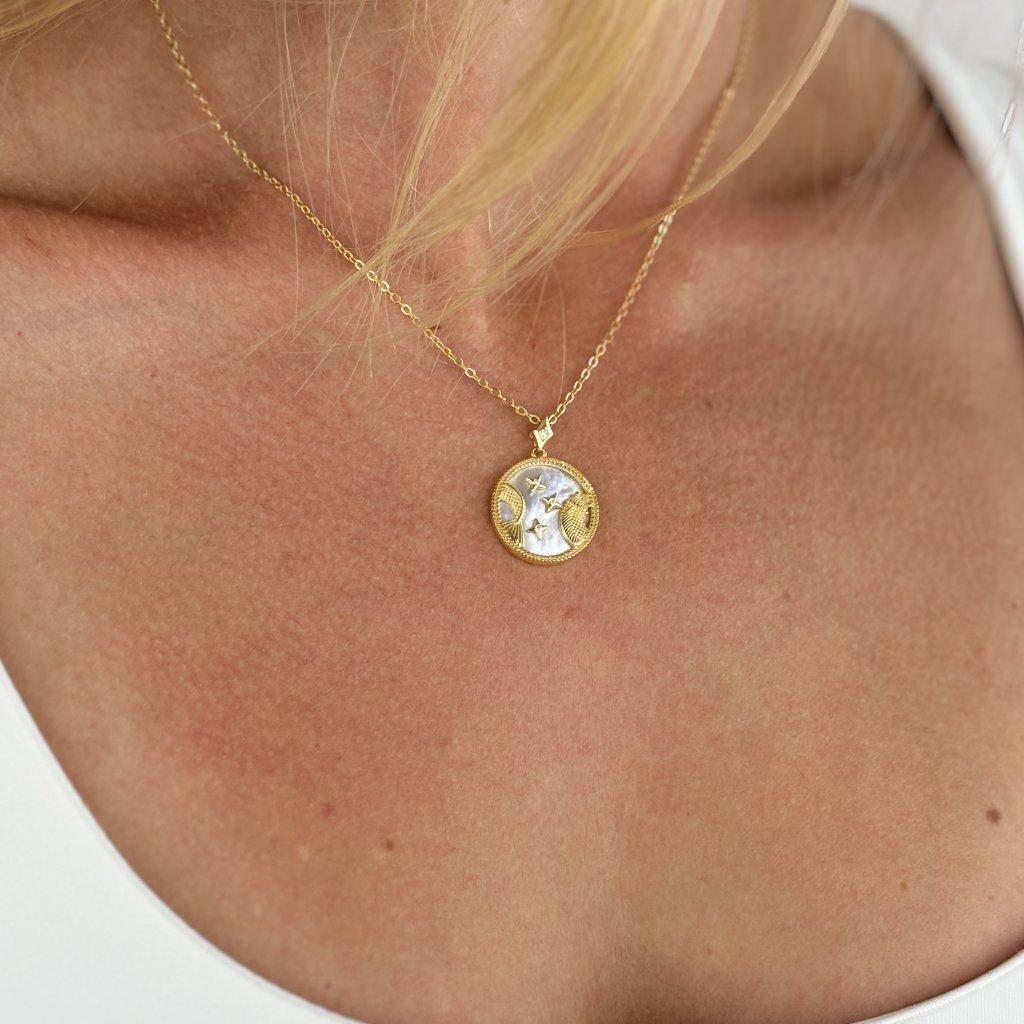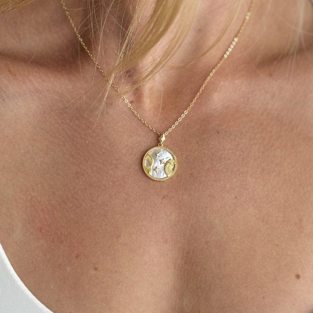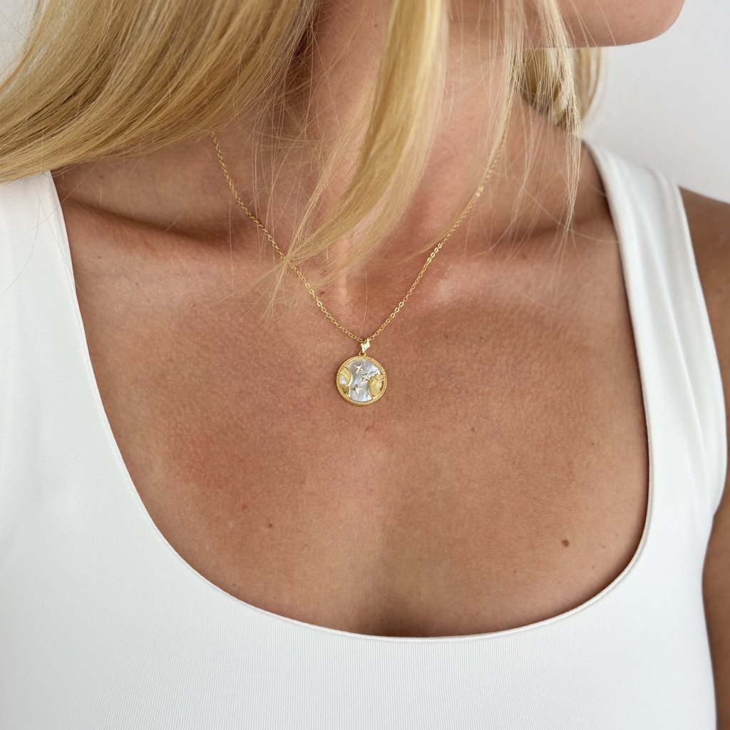 Srebrny łańcuszek wisiorek z MOONLIGHT PISCES to idealny prezent dla każdego, kto urodził się pod znakiem Ryb. Ten klejnot łączy w sobie wrażliwość i piękno tego wodnego znaku. Pozłacany okrągły wisiorek o średnicy 18 mm jest ozdobiony wizerunkiem Ryb na białym tle, które przywołuje blask księżycowego nieba.