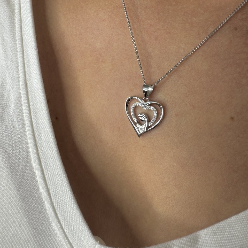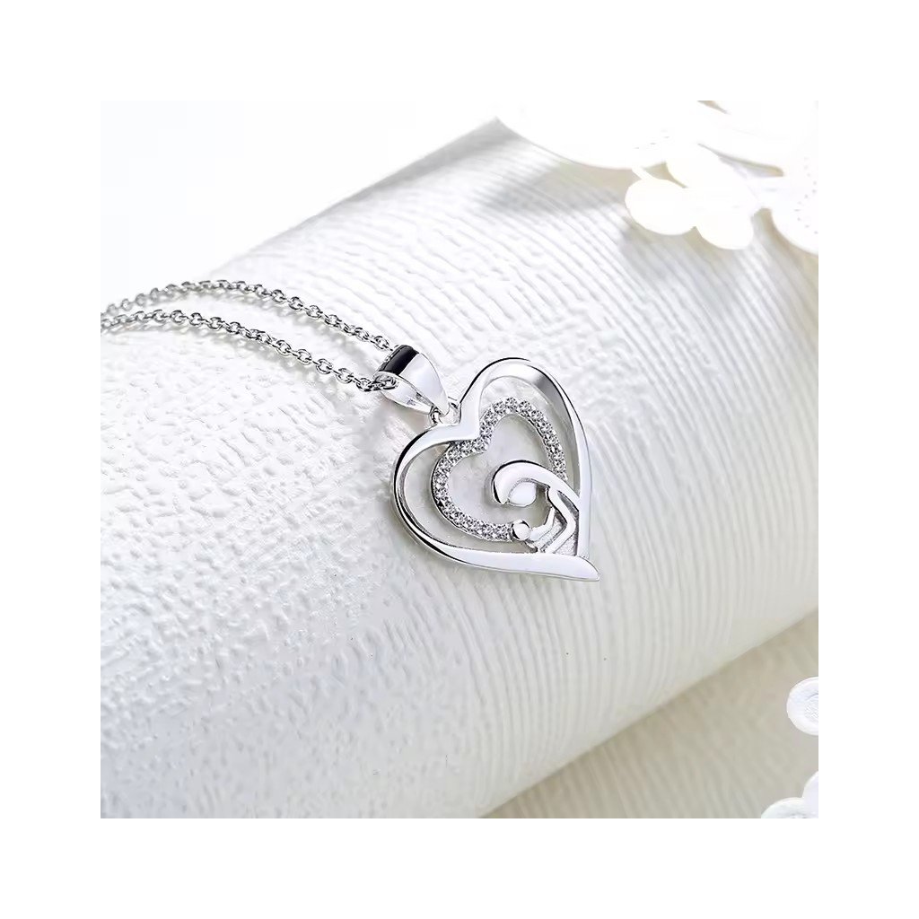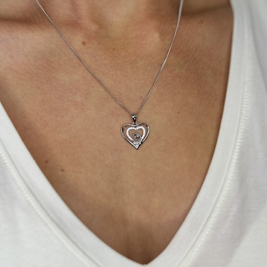 Srebrna wisiorek MADDALENA jest pięknym symbolem miłości matki. Wykonany z wysokiej jakości srebra próby 925/1000 pokrytego rodem, który nadaje mu wysoki połysk i chroni go przed zużyciem. Wisiorek przedstawia sylwetkę matki trzymającej swoje dziecko w ramionach, a wszystko to w sercu ozdobionym błyszczącą cyrkonią.