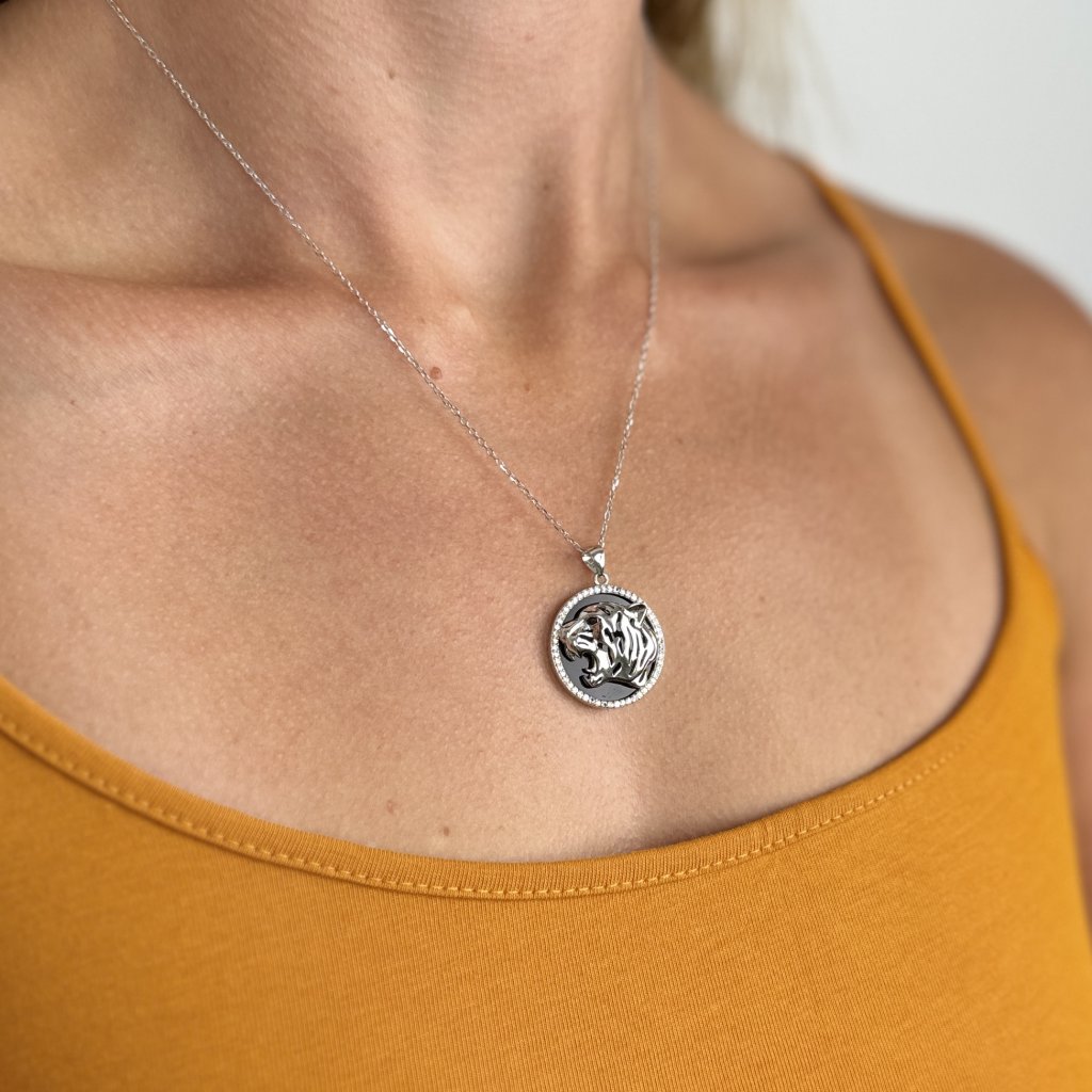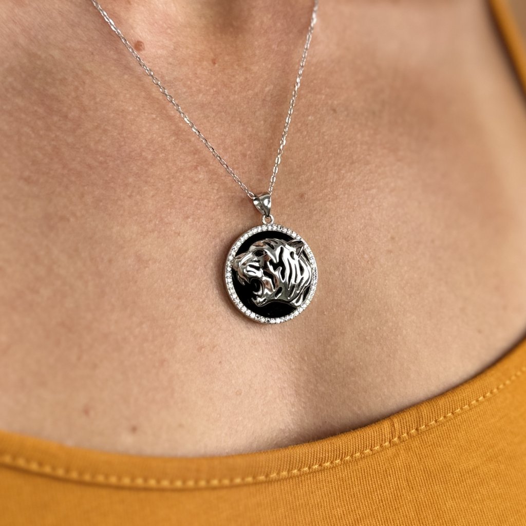 Tygrys zawsze był uważany za symbol siły, odwagi i szczęścia. Osoba nosząca ten klejnot może czerpać z energii tygrysa, wzmacniając swoją intuicję i pewność siebie. Wisiorek zawieszony jest na eleganckim łańcuszku o długości 46 cm, dzięki czemu jest wygodny w noszeniu.