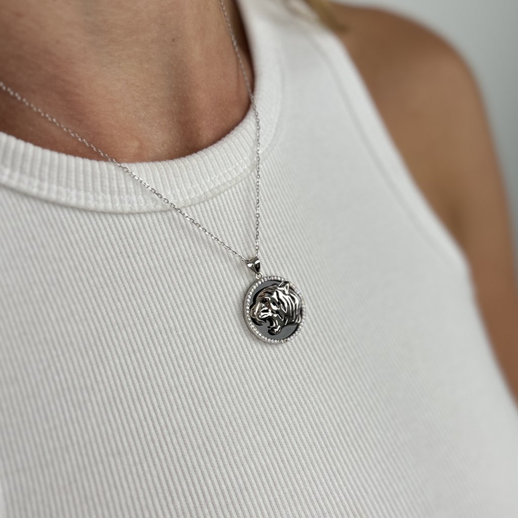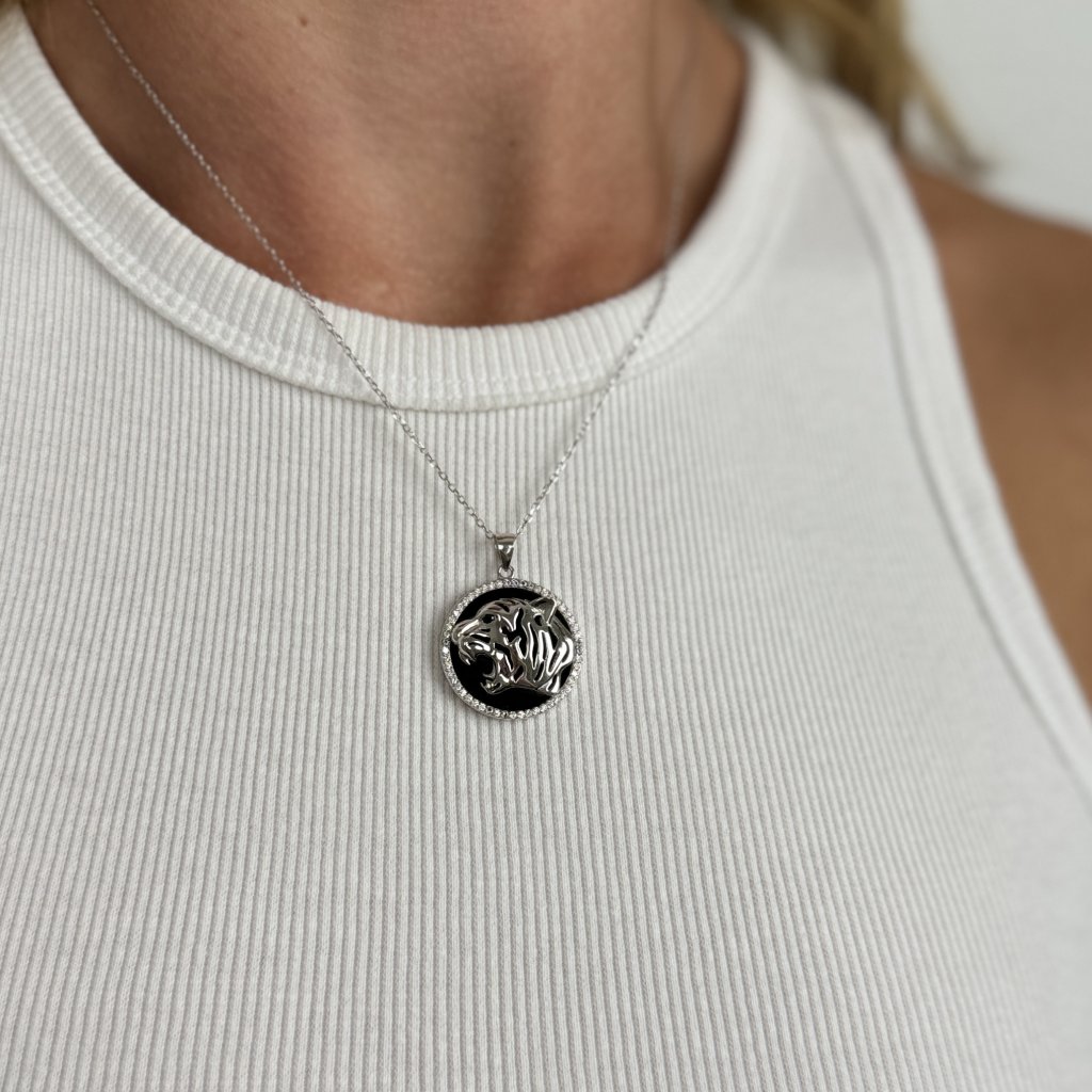 Srebrny wisiorek TYGR z łańcuszkiem to wyjątkowa biżuteria, która niesie ze sobą głęboką symbolikę. Wykonany ze srebra próby 925 z rodowanym wykończeniem, ten zegarek wisiorek o średnicy 23 mm przedstawia majestatycznego tygrysa, którego oczy i paski są podkreślone błyszczącymi czarnymi cyrkoniami.