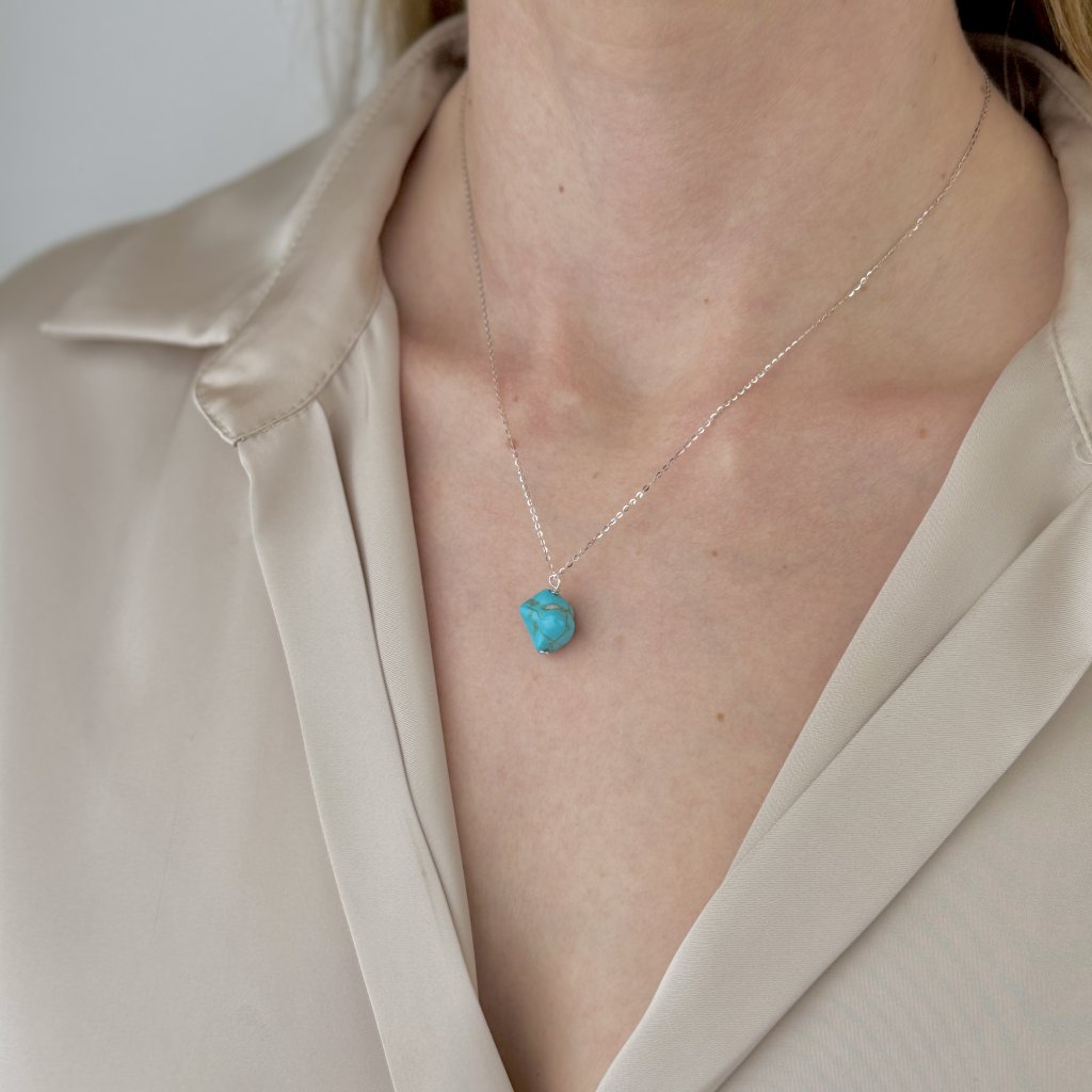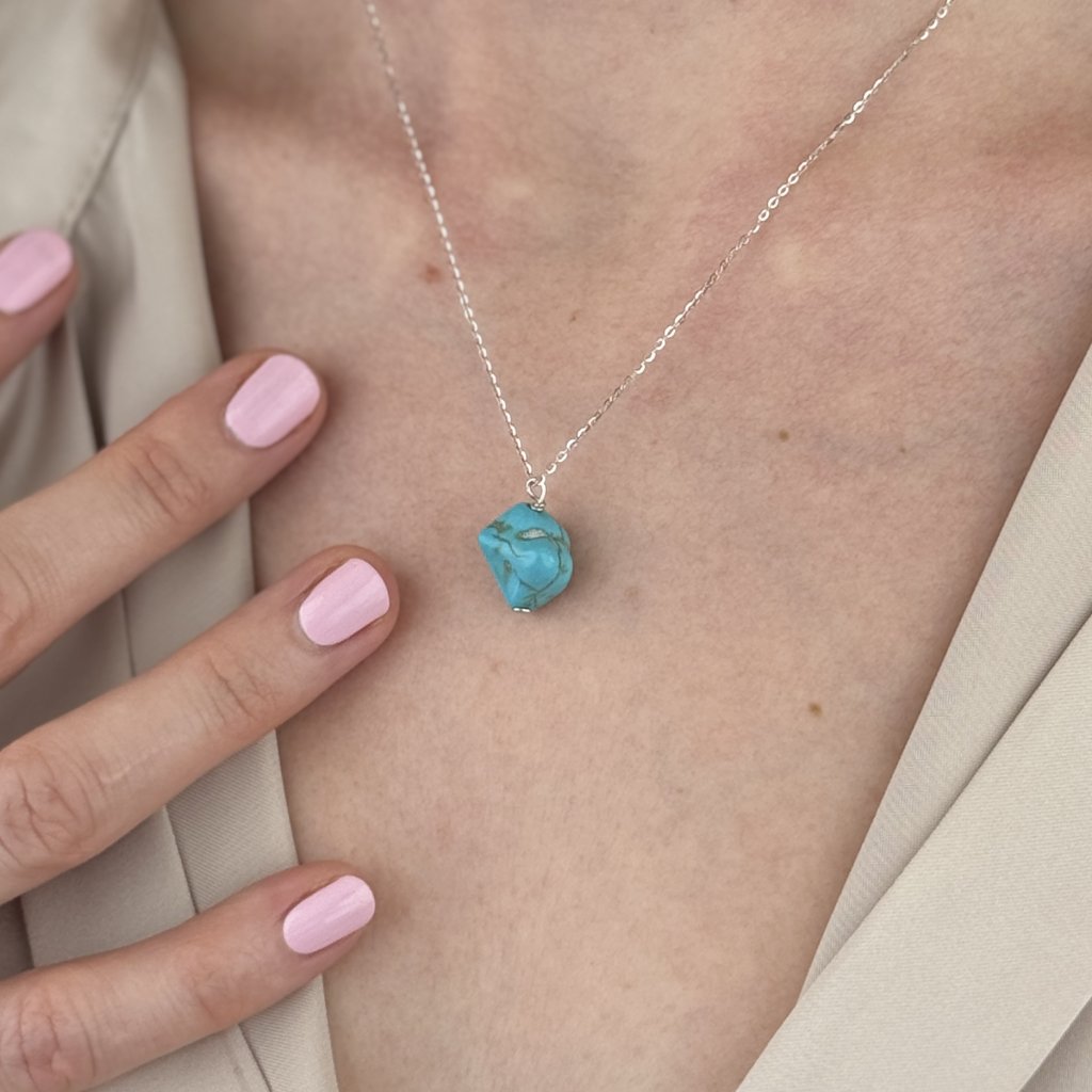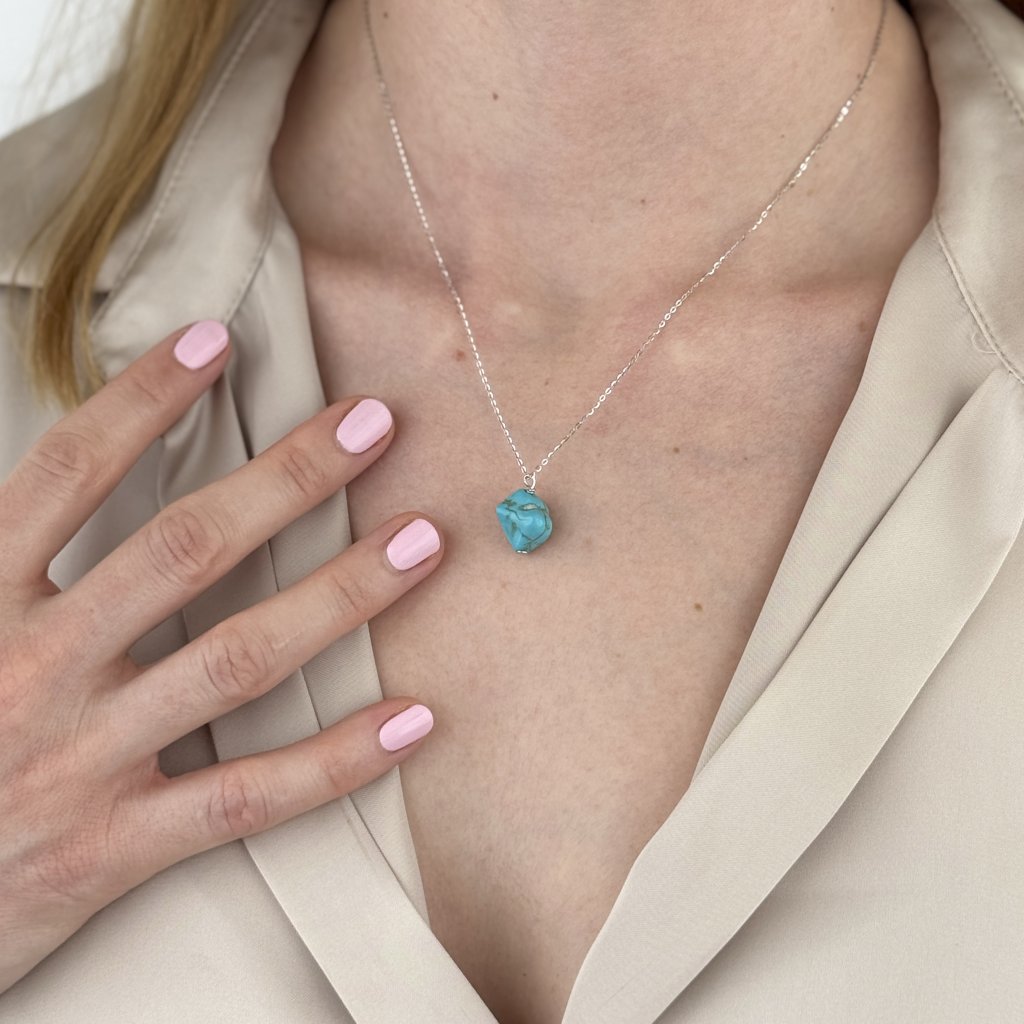 Sercem tego naszyjnika jest wisiorek z turkusowym kamieniem o wymiarach 9 x 12 mm. Dzięki regulowanej długości 40 + 5 cm dopasowuje się do każdego stylu i dekoltu.