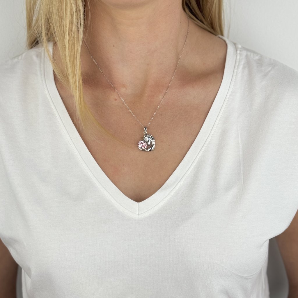 Jednorożec trzyma różową cyrkonię sześcienną (10 × 8 mm), które razem tworzą kształt serca. To połączenie nadaje klejnotowi lśniący i romantyczny charakter. Przy szerokości 18 mm wisiorek jest odważny, ale wciąż elegancki.
