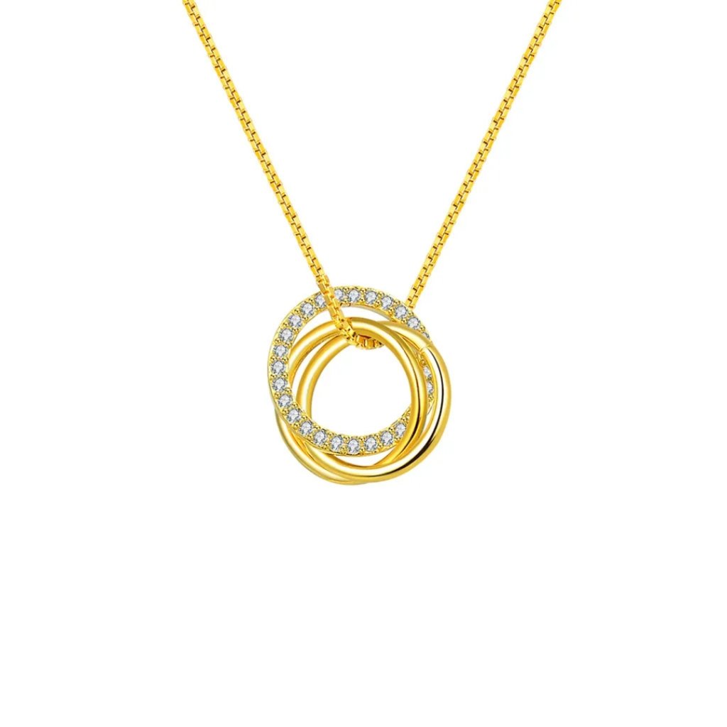 Pozłacany srebrny łańcuszek z wisiorkiem DOLLY reprezentuje harmonijne połączenie symboliki i elegancji. Wisiorek składa się z trzech splecionych ze sobą kółek o średnicy 10 mm, z których jedno ozdobione jest mieniącymi się cyrkoniami. Wykonany z wysokiej jakości srebra próby 925/1000 ze złotym wykończeniem.
