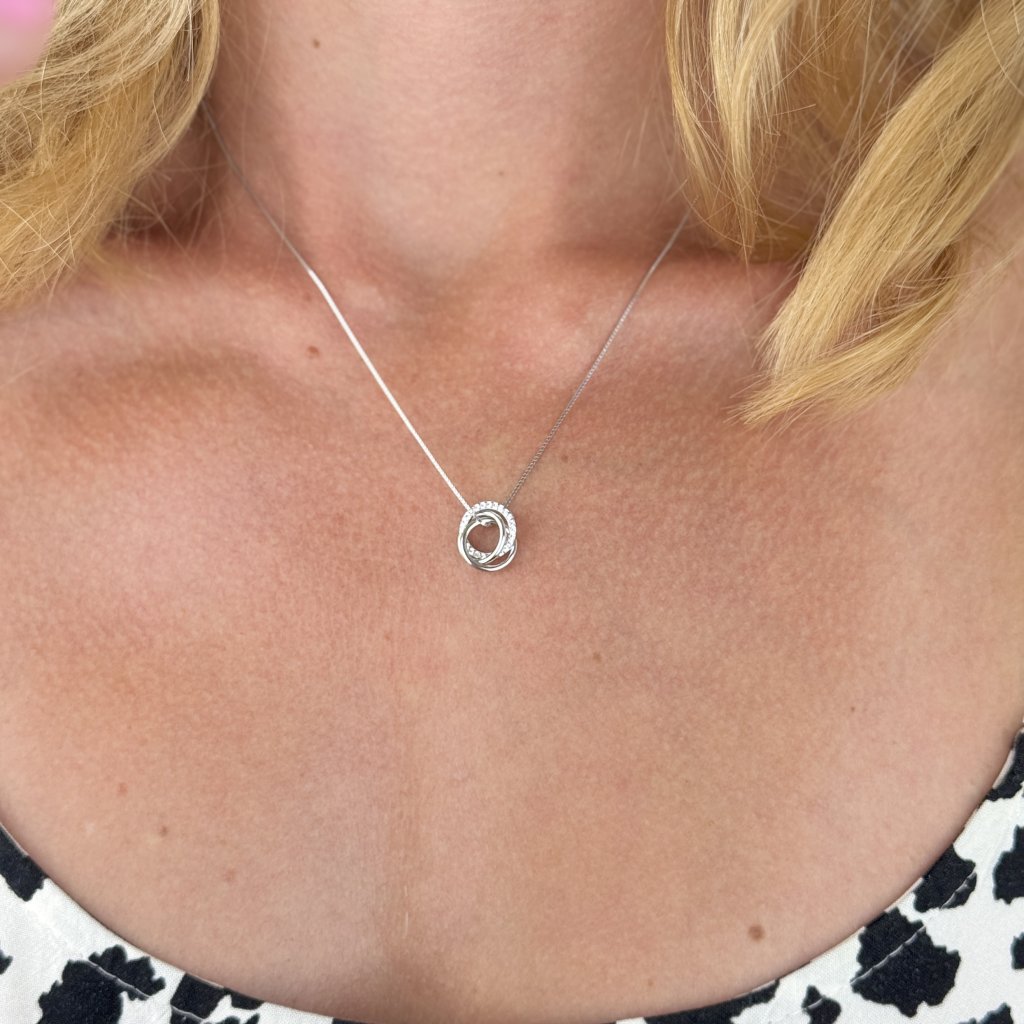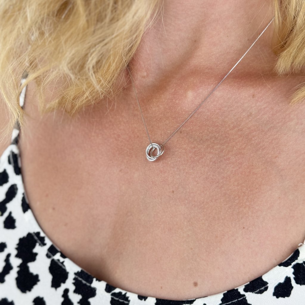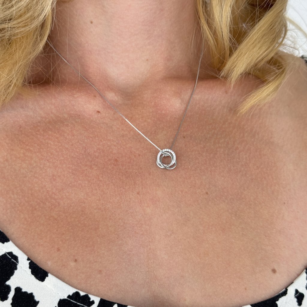 Trzy splecione ze sobą okręgi symbolizują połączenie przeszłości, teraźniejszości i przyszłości. Okrąg wysadzany cyrkoniami reprezentuje obecność, która świeci najjaśniej i oświetla naszą ścieżkę. Łańcuszek o długości 45 cm zapewnia wygodne noszenie i doskonałe wyeksponowanie wisiorka.