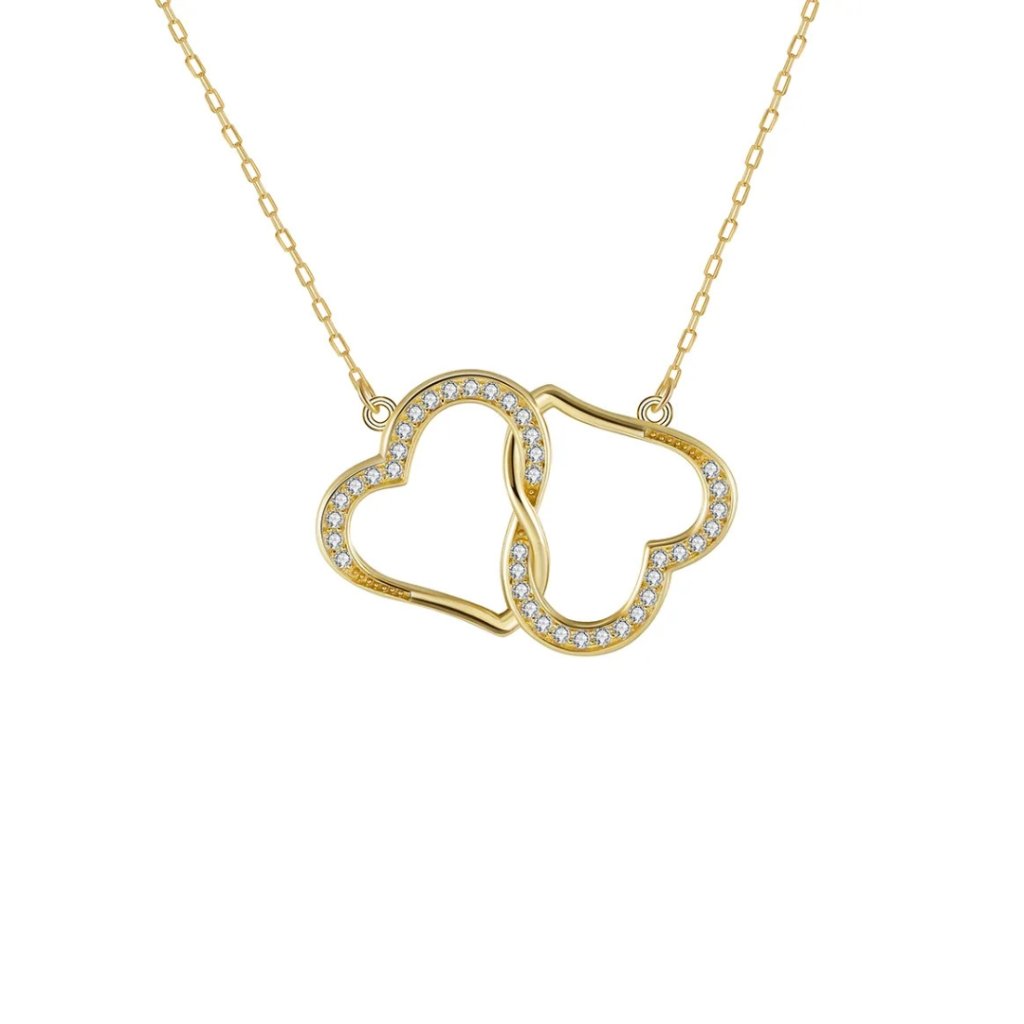 Pozłacany srebrny łańcuszek z wisiorkiem TWIGGY to biżuteria opowiadająca historię miłości i więzi. Wisiorek o szerokości 24 mm tworzy dwa splecione ze sobą serca, częściowo ozdobione błyszczącymi cyrkoniami. Wykonany jest z wysokiej jakości srebra 925/1000 ze złotym wykończeniem, które nadaje klejnotowi luksusowy wygląd.
