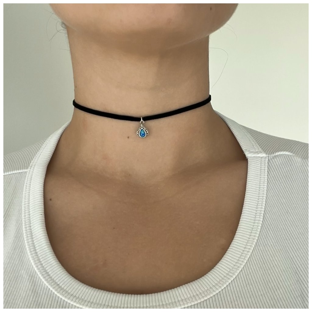 Wisiorek jest uzupełniony czarnym aksamitnym łańcuszkiem, który jest bardzo miękki i wygodny w noszeniu. Długość łańcuszka wynosi 30 cm z możliwością przedłużenia o kolejne 7 cm, dzięki czemu można go dopasować do każdego rozmiaru szyi.