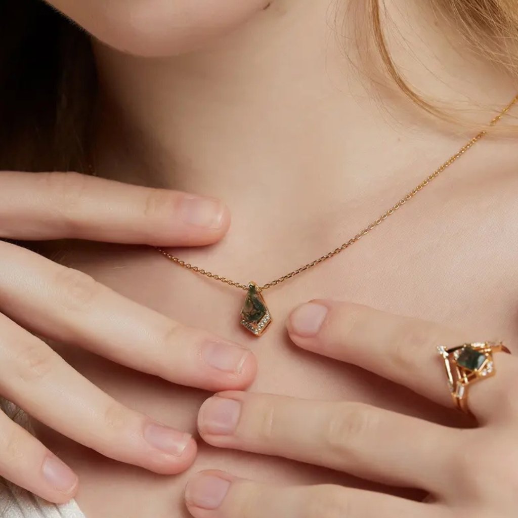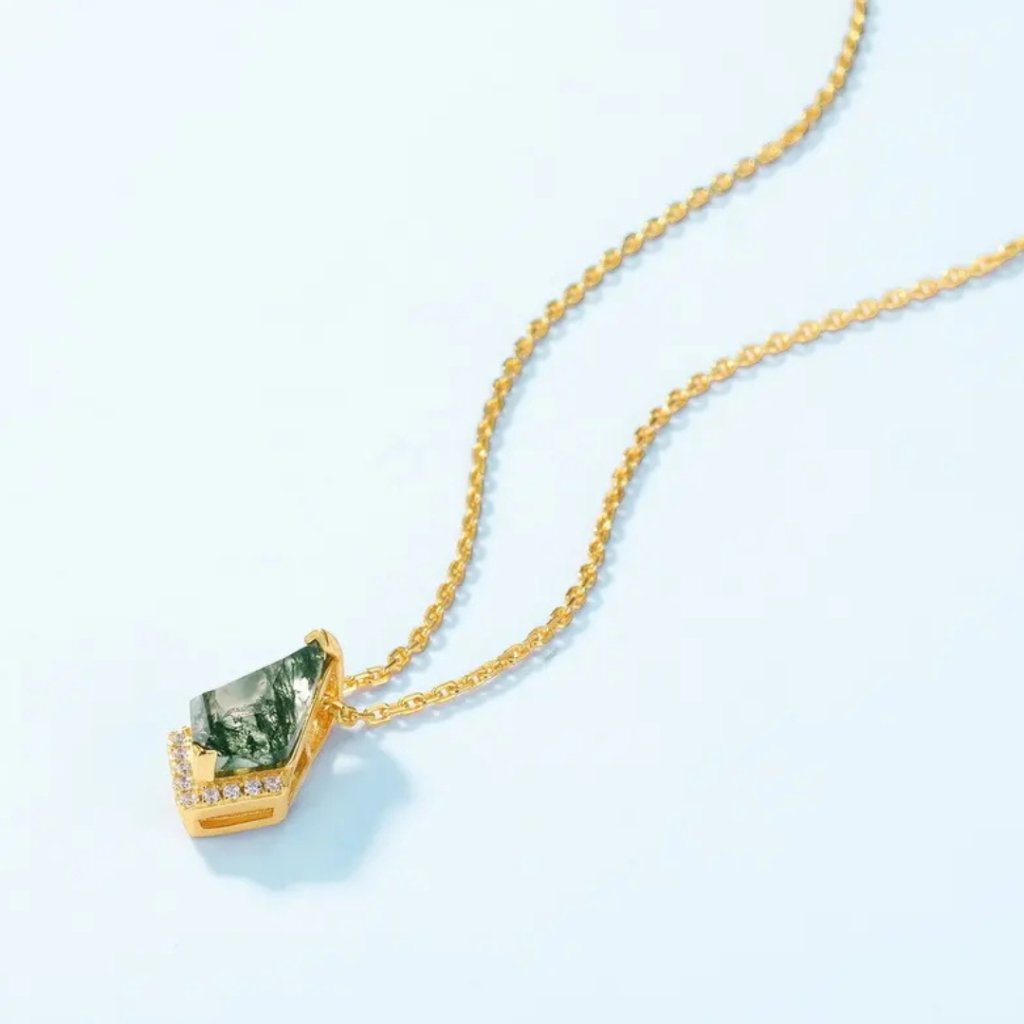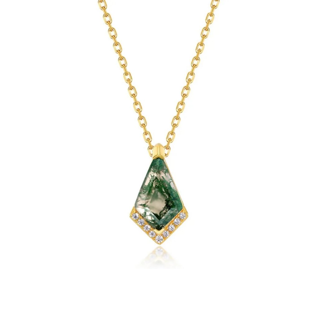 Wisiorek RENEWAL z agatem mszystym to harmonijne połączenie luksusu i naturalnego piękna. Pozłacane srebro próby 925/1000 tworzy efektowny kontrast z unikatowym agatem mszystym, który kryje w sobie tajemniczy zielony krajobraz. Każdy kamień jest absolutnie unikatowy, co czyni tę biżuterię niepowtarzalnym oryginałem.