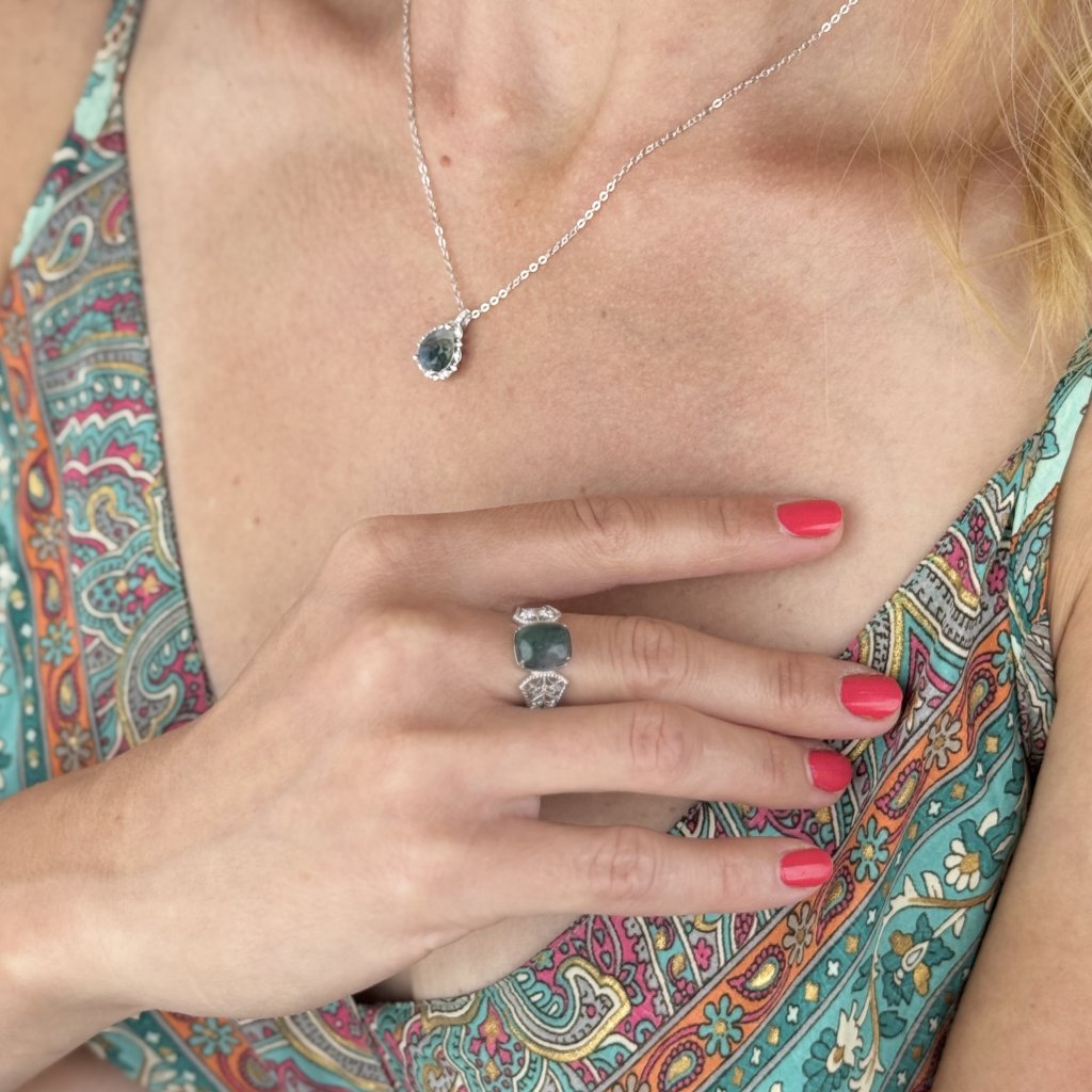 Każdy agat mchowy o wymiarach 10 × 8 mm jest absolutnie unikatowy – zielone inkluzje tworzą fascynujące obrazy przypominające tajemnicze leśne krajobrazy. Wykonany z wysokiej jakości srebra próby 925/1000 z rodowanym wykończeniem dla zachowania długotrwałego blasku.