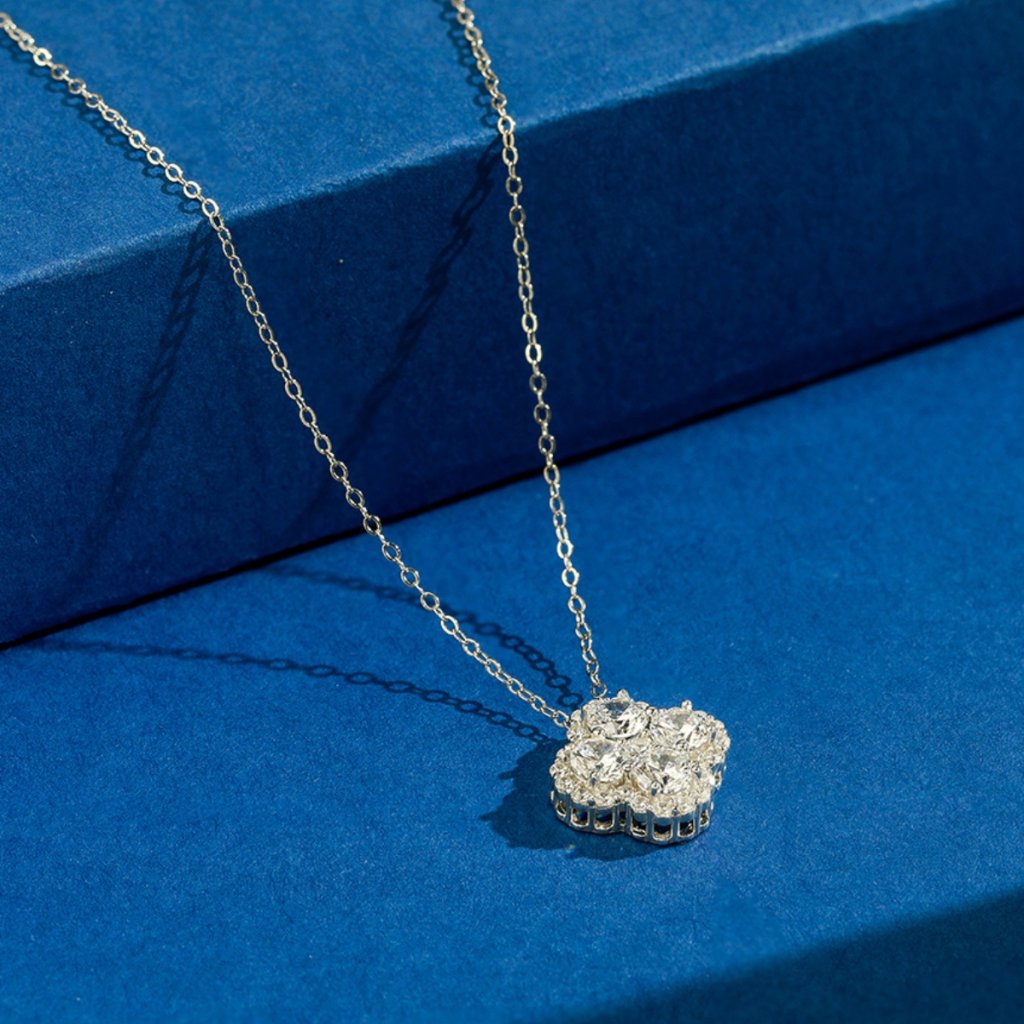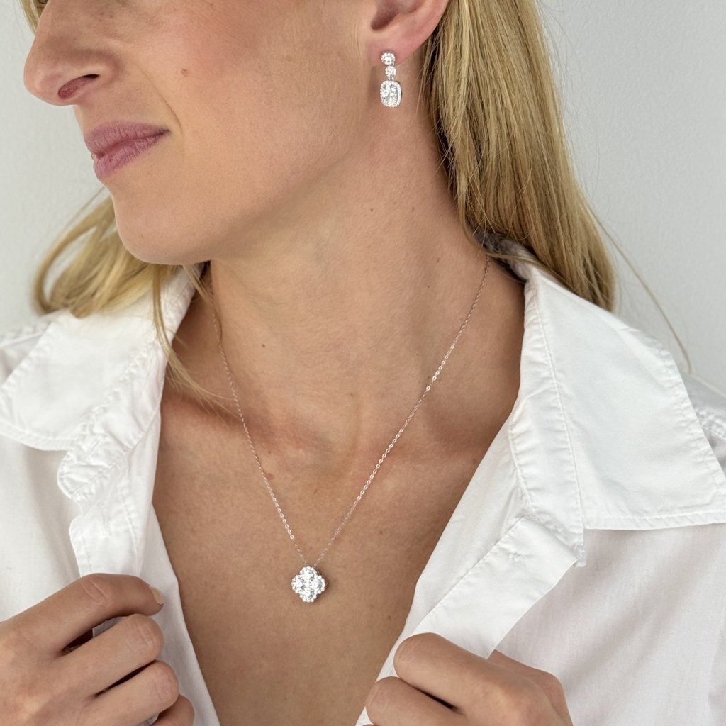 Srebrny łańcuszek z wisiorkiem LUCKY MIU to doskonałe połączenie elegancji i symboliki. Wykonany z najwyższej jakości srebra o próbie Ag925/1000 i pokryty rodem, co zapewnia długotrwały połysk i odporność na zarysowania. Centralnym punktem jest wisiorek w kształcie czterolistnej koniczyny, symbolu szczęścia, który jest ozdobiony delikatnymi cyrkoniami. Ten kwiatowy motyw ma średnicę 14 mm, a jego szerokość wynosi 5 mm. Łańcuszek o długości 45 cm jest wygodny w noszeniu i idealnie pasuje.