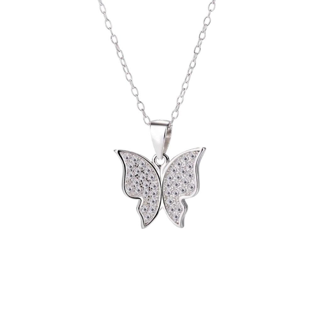 Srebrny zestaw biżuterii CHARM to doskonała harmonia elegancji i figlarności. Ten uroczy zestaw zawiera kolczyki typu sztyfty z zapięciem na sztyft oraz wisiorek na łańcuszku, a wszystko to z motywem uroczych motylków, które symbolizują przemianę, piękno i wolność.